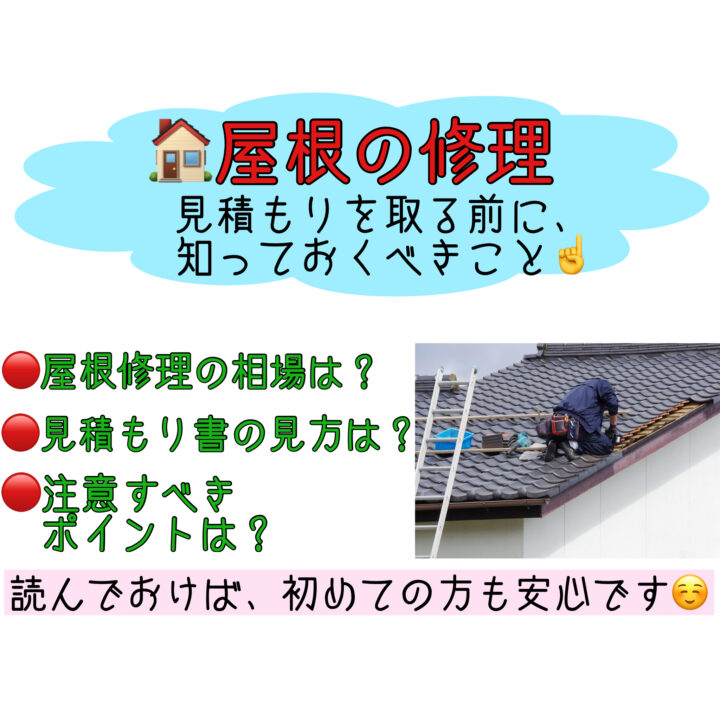 こんにちは!株式会社光輝(プロタイムズ倉敷北店)です。私たちは岡山県倉敷市を中心に外壁塗装・屋根塗装を行なっている塗装会社です。 地域密着で積み重ねてきた実績をもとに、初めての方にも安心してご相談いただけるよう、 わかりやすさと誠実なご説明にこだわっています。 「見積もりを取る前に、何を確認しておけばいいのか?」と不安に感じる方へ。 この記事では、屋根修理の相場や見積書の見方、 注意すべきポイントを、初めての方にもわかりやすく整理しました。 「倉敷市 屋根修理 見積もり」で検索された方に向け、 工事内容別の費用感(補修・塗装・カバー・葺き替え)と、 見積書の“どこを見るべきか”をまとめています。 合わせて、“安すぎる見積もり”に潜むリスクや、無料見積もりの手順・当店の診断ポリシーも解説しています。 費用も施工内容も納得のうえで、長く安心できる屋根修理につなげましょう。 この記事を見ることで、・屋根修理が必要なサインと放置リスク・屋根修理の内容別相場と判断基準・見積書の見方や注意点とトラブル回避術・当店の無料見積もりの流れと診断ポリシーがわかります。 外壁塗装のプロである私たちが、誠実に解説します。倉敷市にて適正価格での屋根修理・点検を希望される方は、ぜひご覧ください。 倉敷市で屋根修理の見積もりが必要なサイン 台風や豪雨のあとには、屋根修理で見積もりが必要となる代表的なサインが増える傾向があります。 ここでは、屋根修理の見積もりが必要と考えられる劣化サインや放置リスクなどを解説します。 倉敷市での気象の影響と屋根リスクの関係 倉敷市は温暖少雨が特徴的な瀬戸内海気候に属しており、年間を通じて晴天の日が多い一方で、 西日本豪雨のような強風や豪雨災害の経験がある地域です。 とくに真備地区などでは豪雨による被害の記憶が新しく、季節の変わり目や台風シーズンは注意が必要です。 そのため、台風後や豪雨後には、色あせや浮き、ひび割れ、雨染み、 棟板金の不具合などの屋根リスクの増加に警戒が必要です。 気になる症状を見つけたら、早めの点検が安心です。 【色あせ】 【ひび割れ】 【雨染み】 これらの屋根リスクを見逃すと、その箇所から雨水が浸入して腐食の原因となるおそれがあるため、 早い段階で修理または点検することが望ましいでしょう。 屋根は高所で確認しづらいため、当店ではドローン等を活用し、安全に現況を可視化してご説明しています (例:写真・動画での共有)。 サインを放置するリスク 屋根の劣化がわかるサインとしては、スレートの割れや金属のサビ、瓦のずれ、シーリングの劣化などが代表的です。 屋根の劣化サインをそのまま放置すると、雨漏りや下地の悪化リスクだけでなく、 工事が大がかりになるリスクも高くなります。 そのまま症状が進行すれば、屋根そのものが損傷を受けたり、 カビやシロアリが発生したりするなど、二次被害も引き起こします。 そうなれば、修理費用の高額化や資産価値の低下、健康被害へと発展しかねないため、 適切なタイミングで補修を行なましょう。 劣化サインを発見したときは、「点検→劣化レベル判定→見積もり」が基本です。 症状が当てはまる方は、倉敷市内の無料点検・見積もりについてご相談ください。 \ お気軽にご相談ください!/ メールでお問い合わせ 工事内容別の相場と判断基準 屋根修理の工事は、屋根材、劣化度合い、下地の状態などで最適解が異なります。補修内容にはひび割れ補修・棟板金交換・シーリング擦り込みなどがあり、劣化症状に応じて決定されます。スレート瓦系の例で見る工事内容別の費用感と適用範囲は以下のとおりです(屋根面積や仕様によって金額は変動します)。倉敷市内の戸建て(例:延床30~40坪、屋根面積60~90m²)を想定した目安としてご覧ください。 工事内容 劣化症状 費用相場 部分補修 抜け落ち ずれ 割れ 2万円~ 棟板金の釘抜け・ゆるみ 2万円~ 塗装工事 塗膜の剥がれ 色あせ チョーキング 色あせ 25~40万円 カバー工法 抜け落ち 割れ ずれ 60~130万円 葺き替え 抜け落ち 割れ ずれ 屋根材の剥がれ 140~200万円 屋根リフォームのおもな工事には、塗装・カバー工法・葺き替えの3種類があります。手軽にできる塗装は費用も安く、一般的に行なわれている工事ですが、ノンアスベスト系スレート屋根など塗装に向かないケースもあるため注意しましょう。ノンアスベスト系スレート屋根は、表面が脆くひび割れが起こりやすいため、補修の際は基本的にカバー工法や葺き替えが推奨されています。また、スレート屋根の塗装でも、瓦の上下段の隙間が塗膜で埋まらないよう縁切り(タスペーサー等)を行なう必要があります。 カバー工法(アドオン工法)とは、既存の屋根をそのままに、その上から新しい屋根材をかぶせる工事です。既存の屋根の解体費用や廃材処理費がかからず費用を抑えられるメリットがあります。一方で、屋根が二重になることから屋根が重くなり、耐